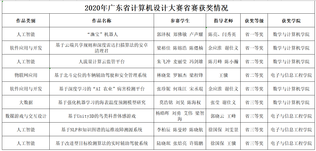6月24日,由广东省教育厅主办的“2020年广东省大学生计算机设计大赛”落下帷幕。今年的比赛有来自广东省80多所本科院校共1129件作品参加。经过初评和复审两个环节,共评选出582件作品晋级省决赛。我校学子在比赛中不畏强手,奋力拼搏,最终获得广东省一等奖2项、二等奖2项、三等奖5项的好成绩。其中来自william威廉中文官网团队的《“渔宝”机器人》和《基于云端共享规则和深度雷达扫描算法的安卓清理君》两项作品勇夺省赛一等奖。