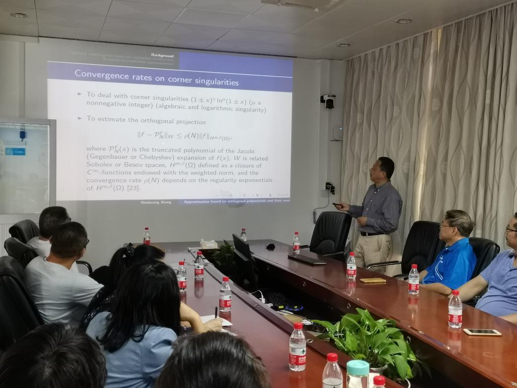 11月21日下午,应我院邀请,中南大学向淑晃教授在霞山校区北院图书馆203会议室作了题为《Approximation based on orthogonal polynomials and their roots》(基于正交多项式及其根的逼近)的精彩报告。报告会由副院长陈入云教授主持,学院领导、相关专业教师及学生20多人参加了本次报告会。