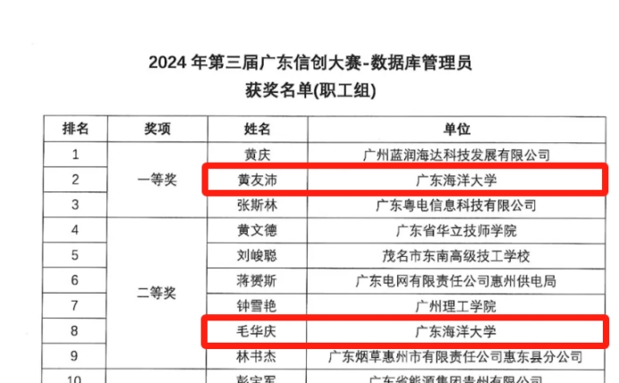 11月29日,第三届广东信创大赛——数据安全管理员职业技能竞赛、数据库管理员技能竞赛在广州举行,来自广东省各地的137家单位千余名选手参与角逐,涉及政府机关、企事业单位、高职院校及科研机构等。william威廉中文官网物联网工程系教师黄友沛、毛华庆发挥出色,最终获得数据库管理员技能竞赛(职工组)一等奖、二等奖的好成绩。