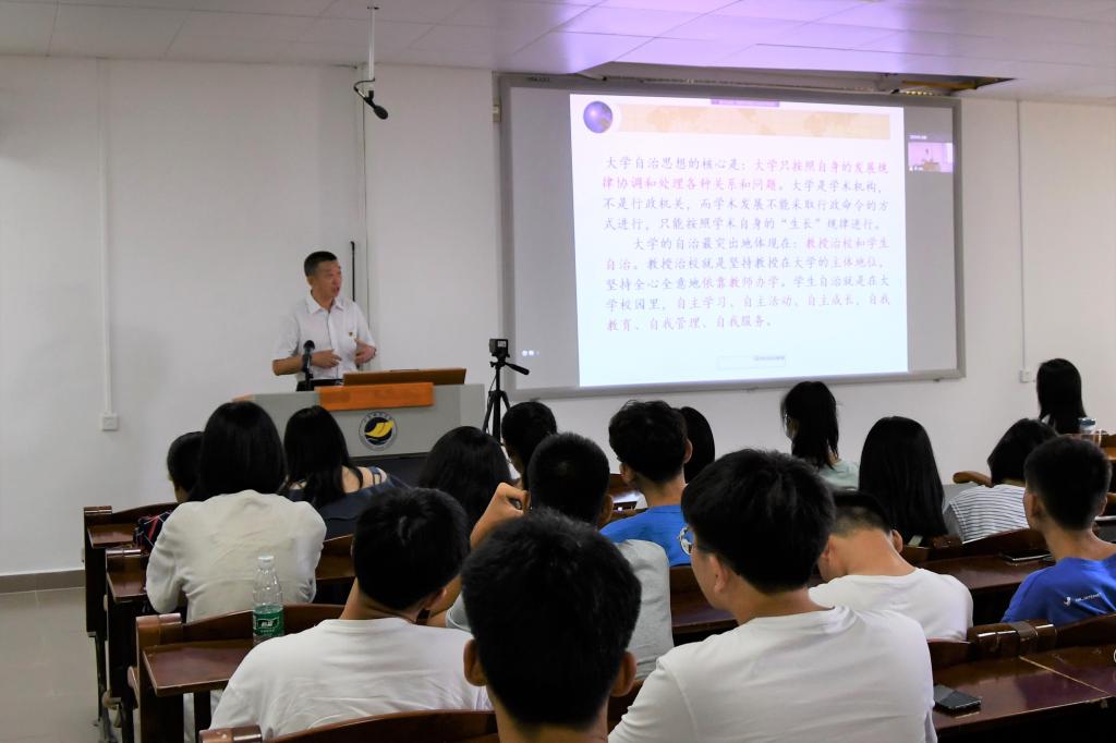 接下来,学院党委书记谢仕义教授以“大学是什么”为主题与新生共同探讨大学的理念、精神、文化和功能的内涵与外延。他以深刻又富有哲理性的语言阐述了崇尚学术、追求卓越、与时俱进才是大学之道;同时他也引导新生要树立崇高的理想信念,具备强烈的社会责任意识,努力学习,方能成就自我、服务社会。