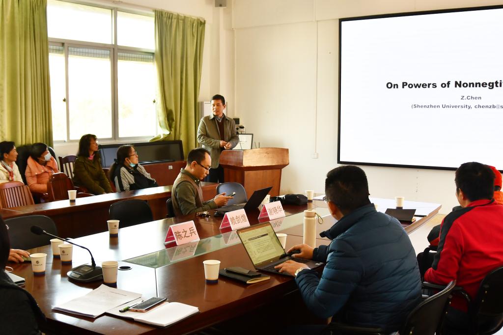 深圳大学数学与统计学院院长陈之兵教授作了题为《关于非负矩阵的幂》的学术报告,他在报告中提出了“0-1矩阵幂运算后非0-1矩阵”的问题,报告由浅入深,内容蕴含数学哲理,增加了在场师生对矩阵的理解,取得了良好的效果。